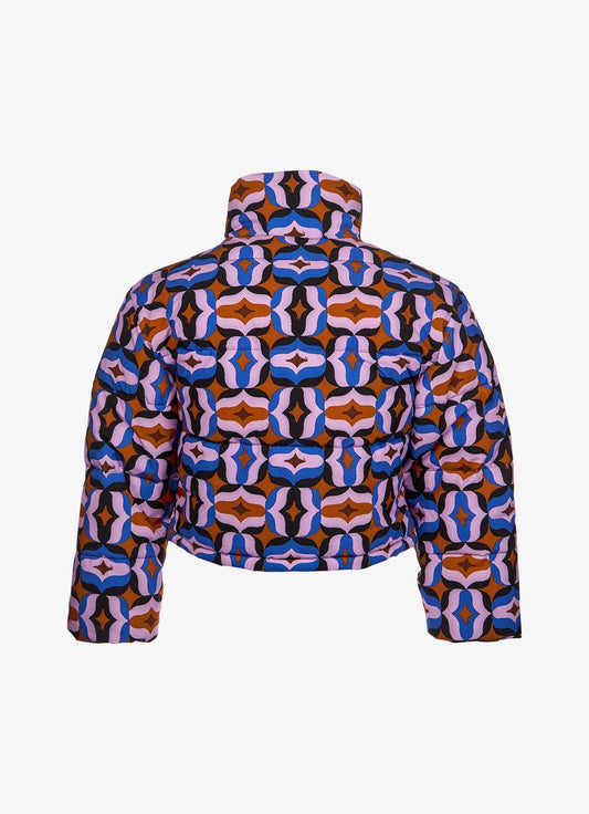 Waterproof Quilted Recycled Poly Jacket - Opulent Tile Print - Blue, Rust Lavender