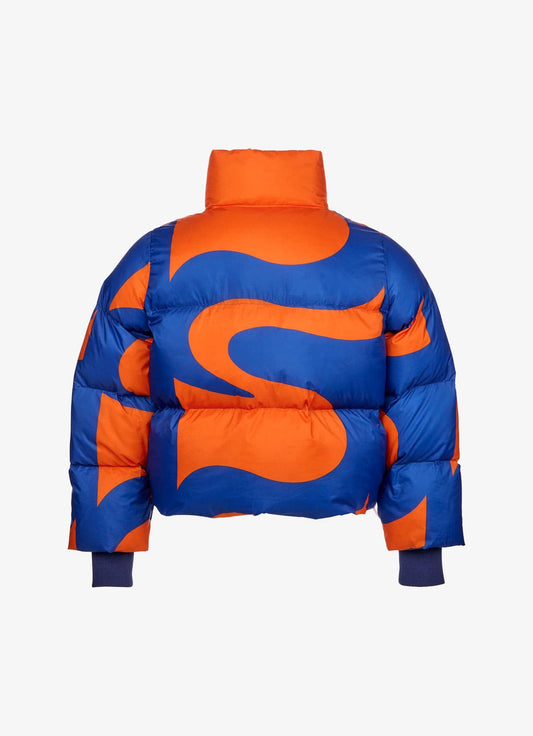 Genderless Overstuffed Soft Down Pillow Jacket with Knit Cuff - Mondo Swirls - Orange & Blue